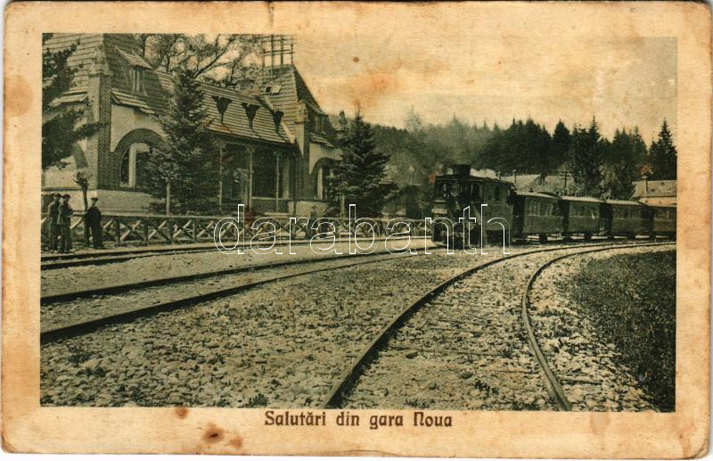 Brassó, Kronstadt, Brasov; Noa nyaraló városi-elővárosi vasútállomás gőzmozdonnyal / Gara din Noua / Bahnhof / railway station with locomotive, train (szakadás / tear)