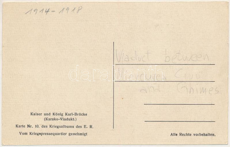 Csíkgyimes, Gyimes, Ghimes; Kaiser und König Karl-Brücke (Karako-Viadukt) Karte Nr. 10. des Kriegsalbums des E. R. / Karakó völgyhíd, viadukt. 1916-ban románok felrobbantották / railway bridge, viaduct blown up by the Romanians in 1916 (EK)