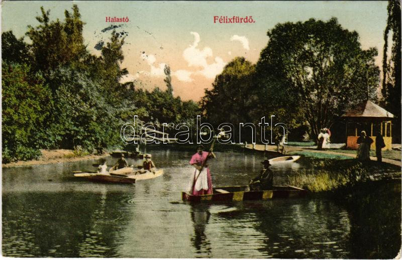 Leírás: Félixfürdő, Baile Felix; Halastó, csónakázók. Singer Ferenc kiadása / fishpond, rowing boats (fa)
