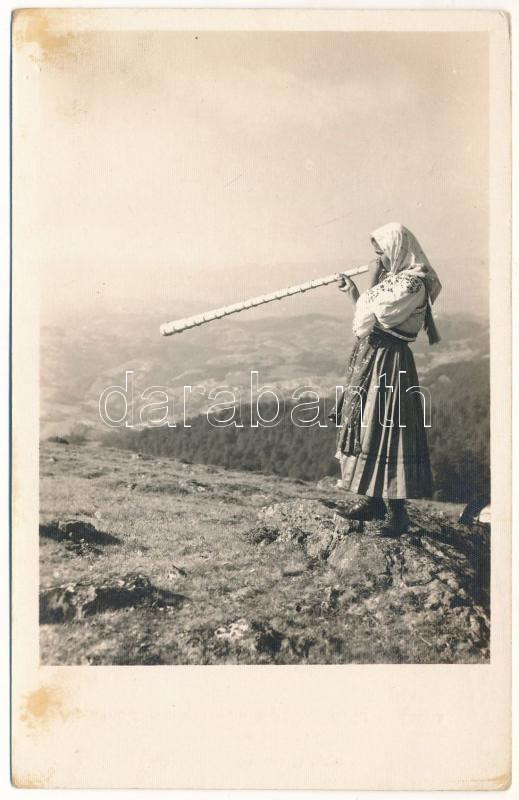 Leírás: Gajna-hegység, Muntele Gaina (Erdélyi-középhegység, Muntii Apuseni); Gaina Targul Fetelor, Fata cu tulnica / Alphornbläserin auf dem Mädchenmarkt / leányvásár a Gajnán, asszony havasi kürttel / girls' fair, alpine horn, Transylvanian folklore. Foto orig. J. Fischer 1939. (fl)