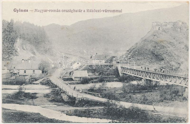 Gyimes, Ghimes; Magyar-román országhatár a Rákóczi várrommal, vasúti híd. Szvoboda Miklós kiadása / castle ruins, Hungarian-Romanian border, railway bridge (EK)