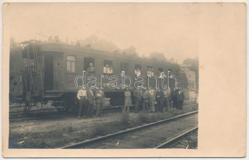 Leírás: Kolozsvár, Cluj (?); Academia de Comert / A kolozsvári Kereskedelmi Akadémia vasúti kocsija / wagon of the Academy of Commerce, train. photo (fl)