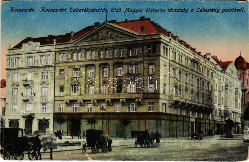 Leírás: Kolozsvár, Cluj; Takarékpénztár, Első Magyar Biztosító társaság a Sebestyén palotával / savings bank, insurance company (EB)