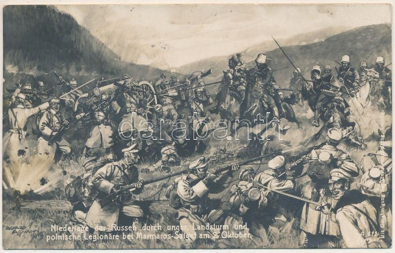 Máramarossziget, Sighet, Sighetu Marmatiei; Niederlage der Russen durch ungar. Landsturm und polnische Legionäre bei Marmaros-Sziget am 2. Oktober / WWI Austro-Hungarian K.u.K. military art postcard s: Richard Assmann (fl)