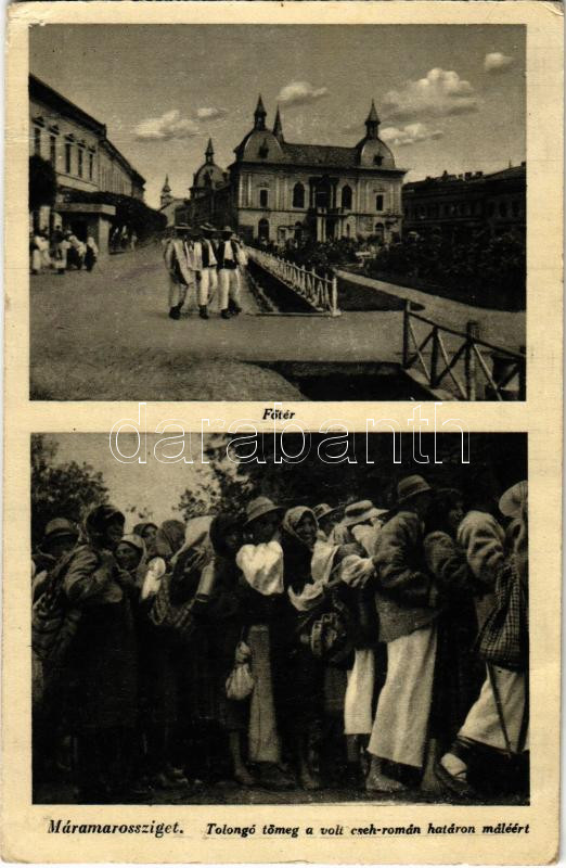 Máramarossziget, Sighetu Marmatiei; Fő tér, Tolongó tömeg a volt cseh-román határon máléért. Knoll Samu kiadása / main square, crowd on the Czech-Romanian border for corn pie + "M. kir. 23. honvéd gyalogezred árkász század" (EK)