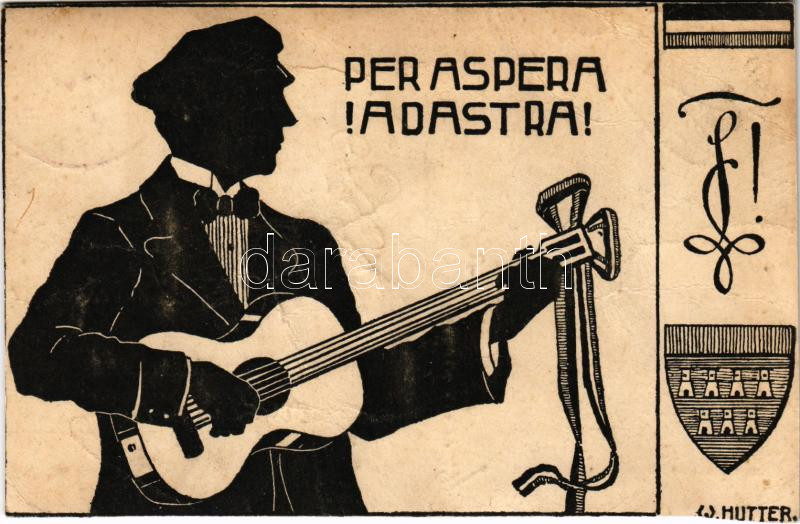 Leírás: Nagyszeben, Hermannstadt, Sibiu; "Per aspera ad astra" kézzel rajzolt sziluett művészlap, studentika. Kunstanstalt Jos. Drotleff / hand-drawn silhouette art postcard, Studentica (vágott / cut)