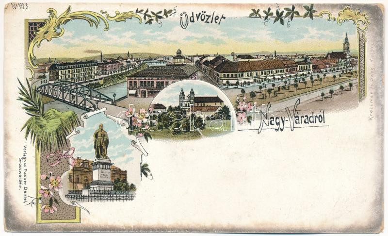 Leírás: Nagyvárad, Grosswardein, Oradea; Szent László szobor, zsinagóga / statue, synagogue. Pauker Danuel Art Nouveau, floral, litho (Rb)