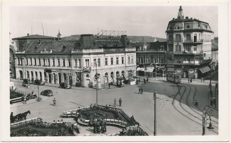 Nagyvárad, Oradea; Bémer tér, Magyar Általános Hitelbank nagyváradi fiókja, Általános Hitelbank, Ady, Vadas, Fazekas üzlete, drogéria, sorsjegyáruda, villamos, automobilok, magyar katonák / square, banks, shops, drugstore, automobiles, tram, Hungarian soldiers