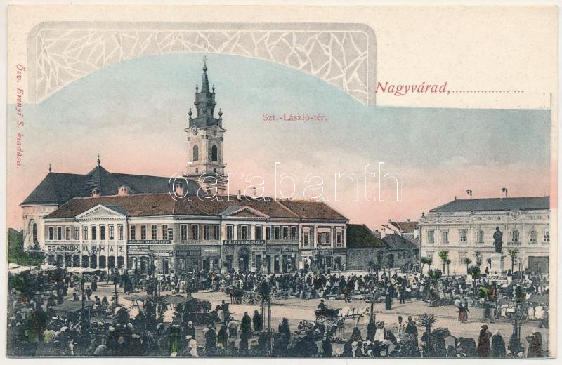 Nagyvárad, Oradea; Szent László tér, piac, Csarnok kávéház, Általános Takarékpénztár, Adria biztosítótársaság fiókja, Dell'Orto K. üzlete. Özv. Erenyi S. kiadása / square, market, café, savings bank, insurance company, shops