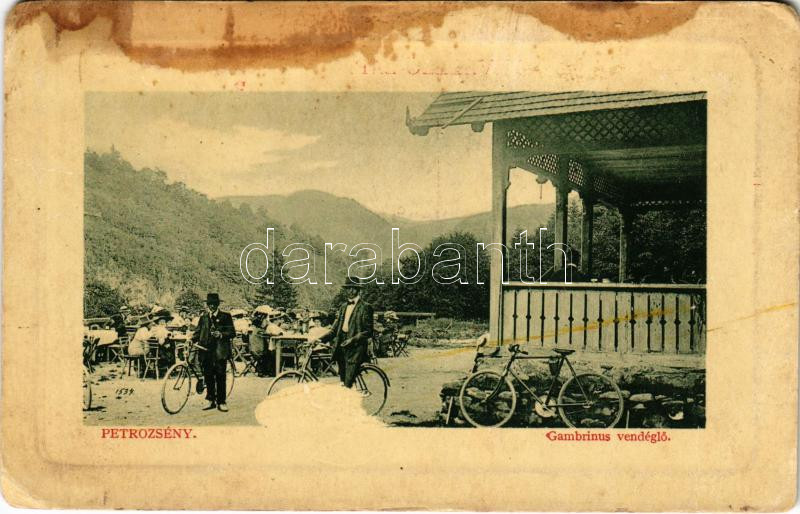 Petrozsény, Petrosani; Gambrinus vendéglő, étterem, férfiak kerékpárra... https://www.darabanth.com/hu/472-Gyorsarveres/472.0/Kepeslapok/Erdely~1500007/Petrozseny-Petrosani-Gambrinus-vendeglo-etterem-ferfiak-kerekparral-WL-Bp-5400-1911-~II3182831