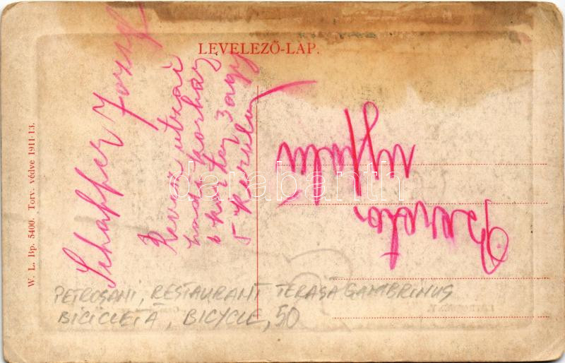Leírás: Petrozsény, Petrosani; Gambrinus vendéglő, étterem, férfiak kerékpárral. W.L. Bp. 5400. 1911-13. / restaurant, inn, men with bicycles (EM)