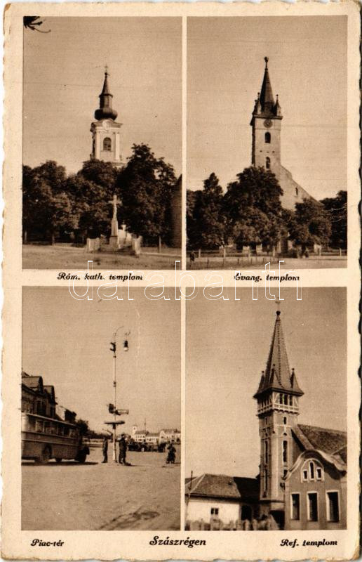 Szászrégen, Reghin; Római katolikus templom, Evangélikus templom, Piac tér, autóbusz megállóhely, Református templom / Catholic, Lutheran and Calvinist churches, market, autobus, bus stop