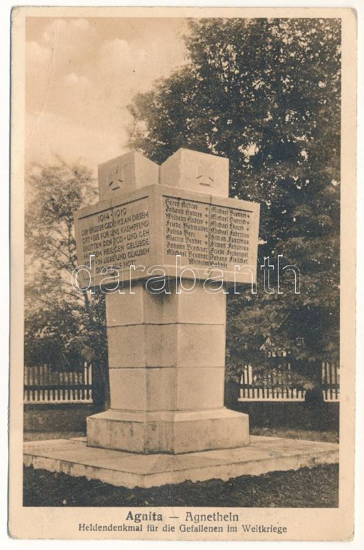 Szentágota, Agnetheln, Agnita; Heldenkdenkmal für die Gefallenen im Weltkriege / Első világháborús hősök szobra, emlékmű. F. Theil Fotograf / WWI military heroes' monument (fa)