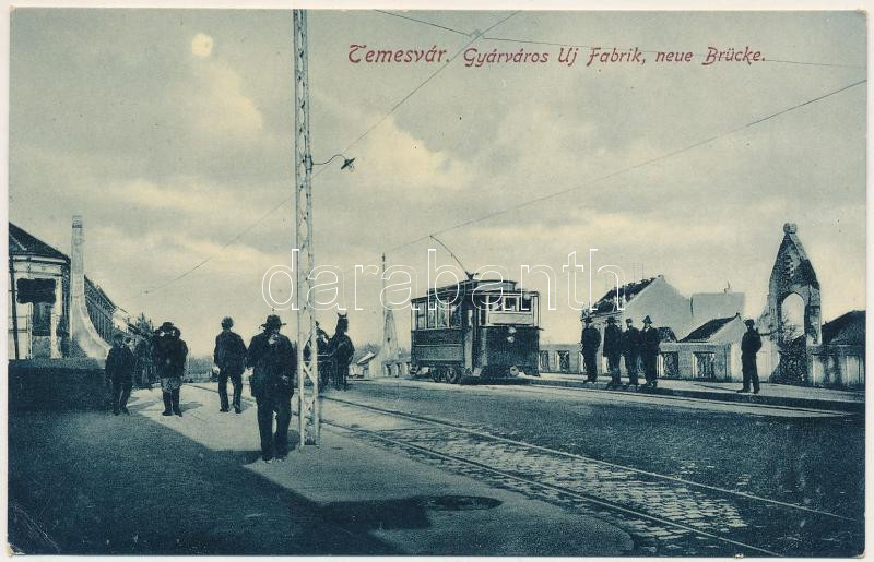 Leírás: Temesvár, Timisoara; Gyárváros, új híd, villamos. Gerő Manó kiadása / Fabrik, neue Brücke / street view, new bridge, tram (EK)