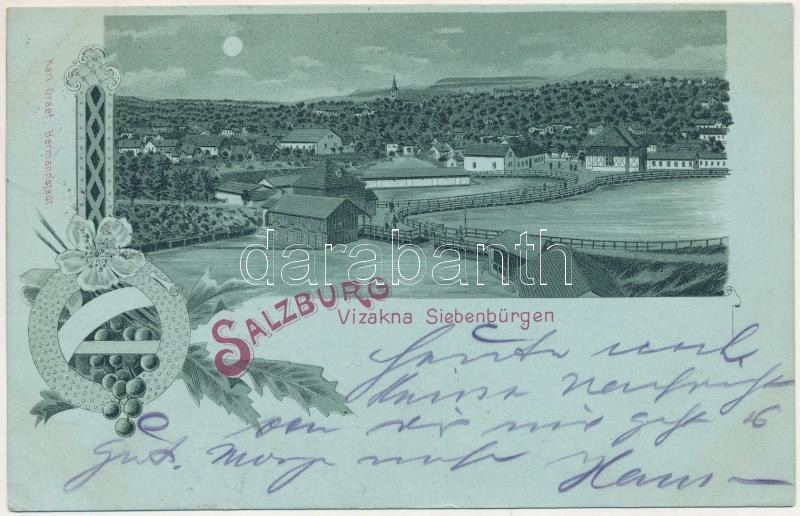 Leírás: Vízakna, Salzburg, Ocna Sibiului; Sós gyógyfürdő. Karl Graef kiadása / spa, salt bath. Art Nouveau, floral, litho (EK)