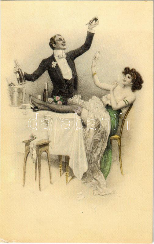 Leírás: Finoman erotikus képeslap, mulatozó pár - Reprint Kósa Pál gyűjteményéból / Gently erotic art, couple having fun - modern reprint