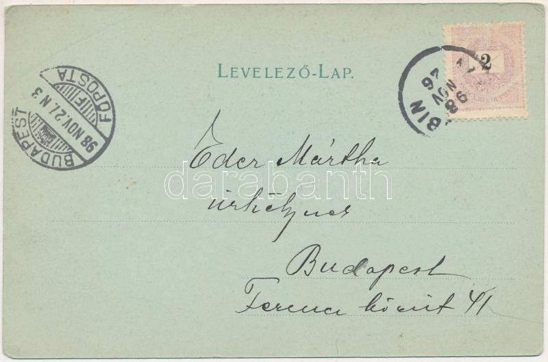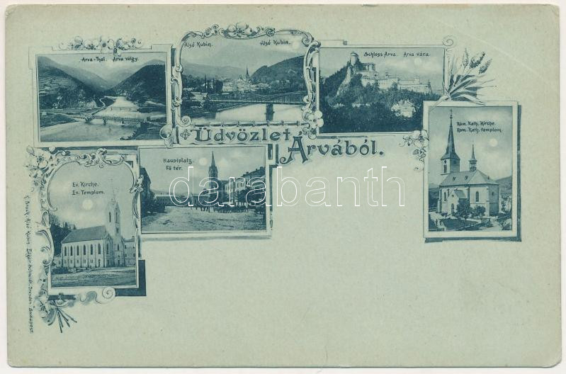 1898 (Vorläufer) Alsókubin, Dolny Kubín (Árva, Orava); Üdvözlet Árvából. Árva-völgy, Alsó-Kubin, Árva vára, Evangélikus templom, Fő tér, Római katolikus templom. K. Bruck kiadása / valley, castle, Lutheran church, main square, Catholic church. Art Nouveau, floral (kopott sarkak / worn corners)