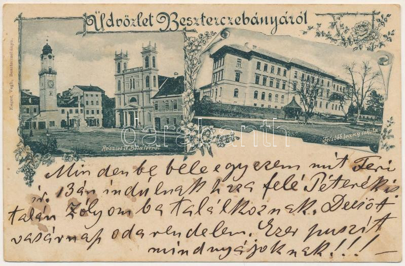 1899 (Vorläufer) Besztercebánya, Banská Bystrica; IV. Béla tér, felsőbb leány iskola. Eugen Végh kiadása / square, girl school. Art Nouveau, floral (fl)