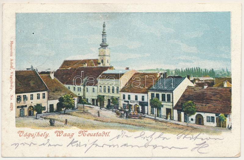 Leírás: 1902 Vágújhely, Neustadt an der Waag, Nové Mesto nad Váhom; Fő tér. Horovitz Adolf kiadása / main square