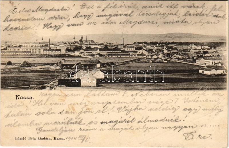 1904 Kassa, Kosice; látkép. László Béla kiadása / general view (fl) https://www.darabanth.com/hu/472-Gyorsarveres/472.0/Kepeslapok/Felvidek~1500008/1904-Kassa-Kosice-latkep-Laszlo-Bela-kiadasa-general-view-fl~II3177071