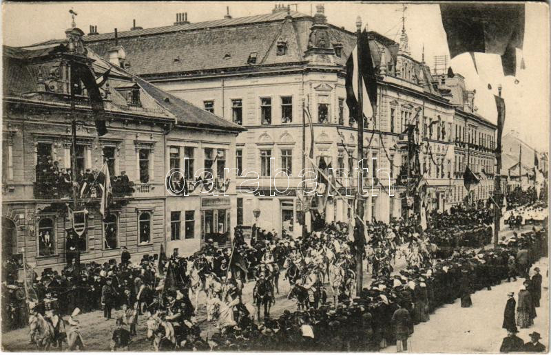 1906 Kassa, Kosice; Zemplén vármegye lovas díszbandériuma, a Kassai Dalegylet és a papság Kassán 1906. október 29-én II. Rákóczi Ferenc és bujdosó társai hamvainak hazahozatala és újratemetése alkalmából. Nyulászi Béla kiadása / funeral (reburial) ceremony of Rákóczi and his companion (EK)