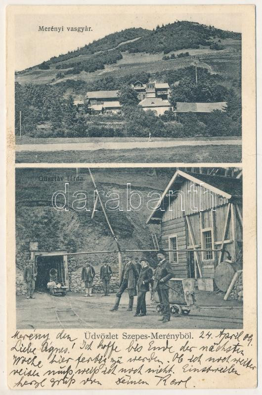 1909 Merény, Szepesmerény, Nálepkovo; Merényi vasgyár, Gusztáv tárna a... https://www.darabanth.com/hu/472-Gyorsarveres/472.0/Kepeslapok/Felvidek~1500008/1909-Mereny-Szepesmereny-Nalepkovo-Merenyi-vasgyar-Gusztav-tarna-a-banyaban-iparvasut~II3197883