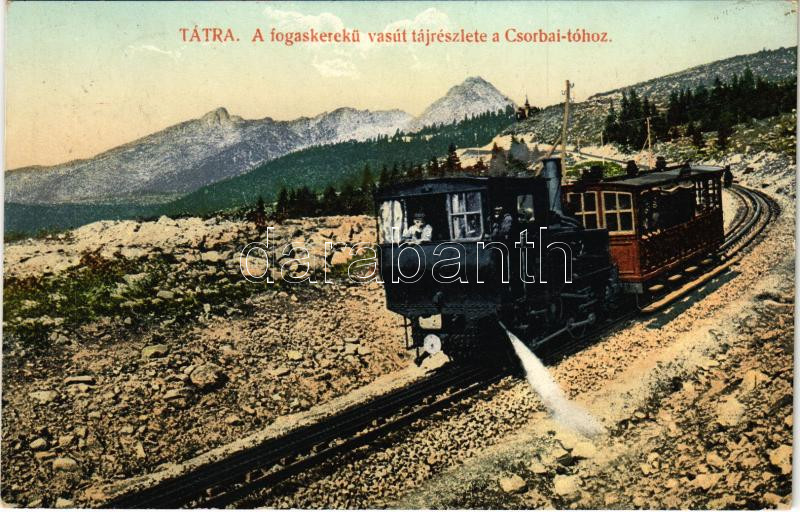 1909 Tátra, Magas-Tátra, Vysoké Tatry; A fogaskerekű vasút tájrészlete a Csorba-tóhoz, vonat, gőzmozdony. Feitzinger Ede No. 252. 1908/18. / Zahnradbahn / Cog-wheel railway to Strbské pleso, locomotive, train (EK)
