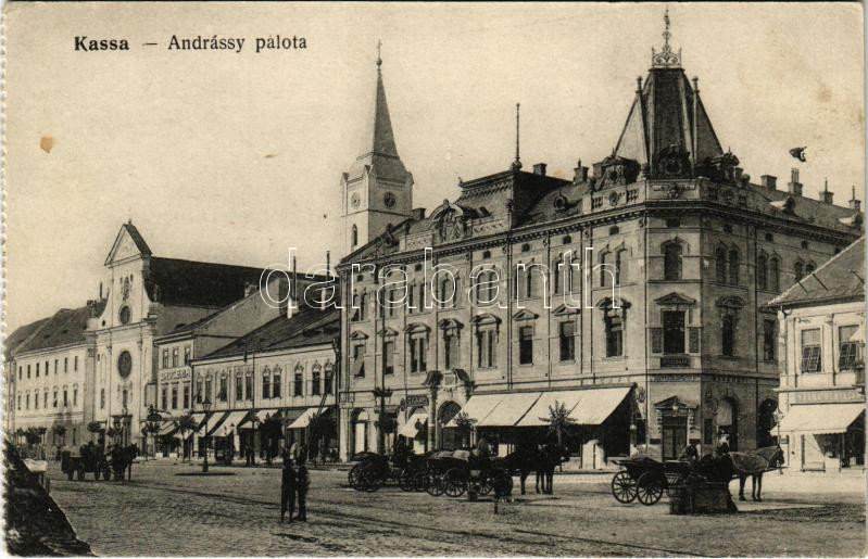 1910 Kassa, Kosice; Andrássy palota és kávéház, drogéria, Gilányi, Varga Bertalan üzlete és saját kiadása / palace and café, drugstore, publisher's shop (EK)