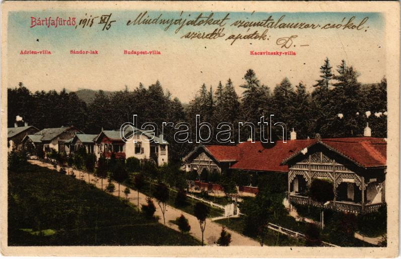 1915 Bártfa-fürdő, Bardejovské Kúpele, Bardiov, Bardejov; Sándor lak, Adrien, Budapest és Kaczvinszky villa. Eschwig és Hajts kiadása. Hajts Kornél felvétele / street view, villas