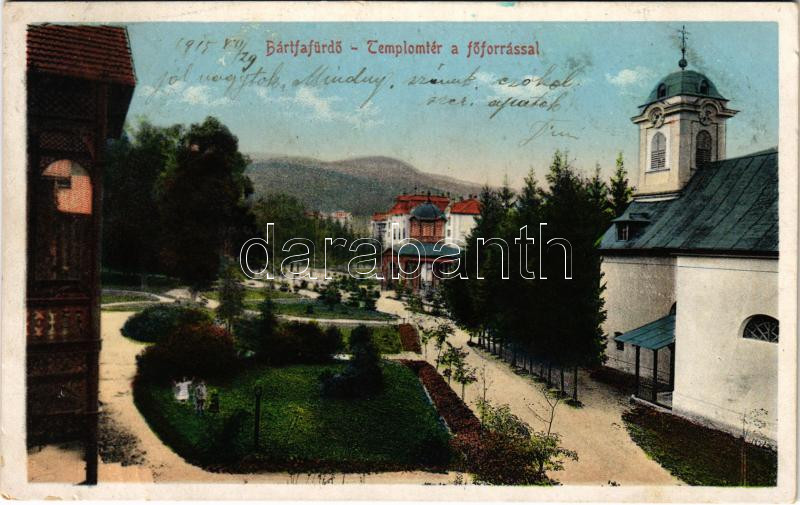 1915 Bártfa-fürdő, Bardejovské Kúpele, Bardiov, Bardejov; Templom tér és Fő forrás. Eschwig és Hajts kiadása, Hajts Kornél felvétele / church, mineral water spring (EK)