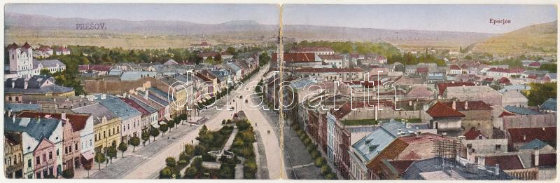 1920 Eperjes, Presov; Fő utca. K. Székely kiadása, 2-részes kinyitható pnaorámalap / main street. 2-tiled folding panoramacard (hajtásnál szakadt / bent til broken)