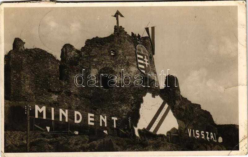 1938 Fülek, Filakovo; várrom "Mindent vissza" irredenta felirattal, Nagymagyarország és magyar zászló, címer. Krämer I. kiadása / castle ruins with irredenta propaganda, Hungarian flag and coat of arms (b)