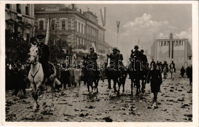 Leírás: 1938 Kassa, Kosice; bevonulás, Horthy Miklós kormányzó fehér lovon / entry of the Hungarian troops, Horthy on white horse