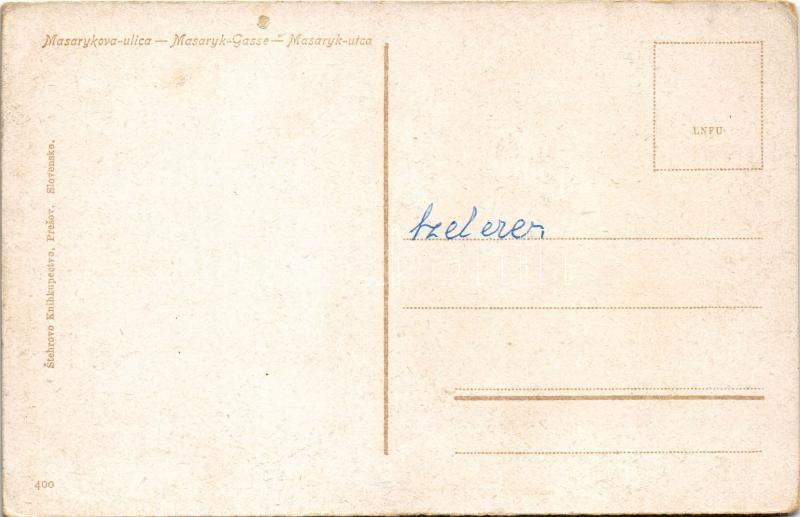 Leírás: Eperjes, Presov; Masaryk utca, piac, cipő áruház üzlete. Stehrovo Knihkupectvo kiadása / street, shops, market (kopott sarkak / worn corners)