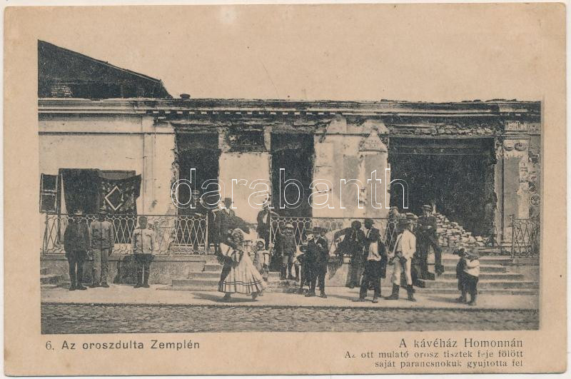 Homonna, Homenau, Humenné; Az oroszdúlta Zemplén 6., Kávéház romjai, az ott mulató orosz tisztek feje fölött saját parancsnokuk gyújtotta fel. Varga Bertalan kiadása / cafe ruins after the Russian attack (Rb)