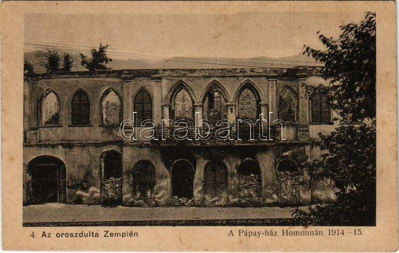 Leírás: Homonna, Humenné; Az oroszdúlta Zemplén. A Pápay-ház romjai 1914-15. Varga Bertalan kiadása / WWI villa ruins after the Russian destruction (fl)