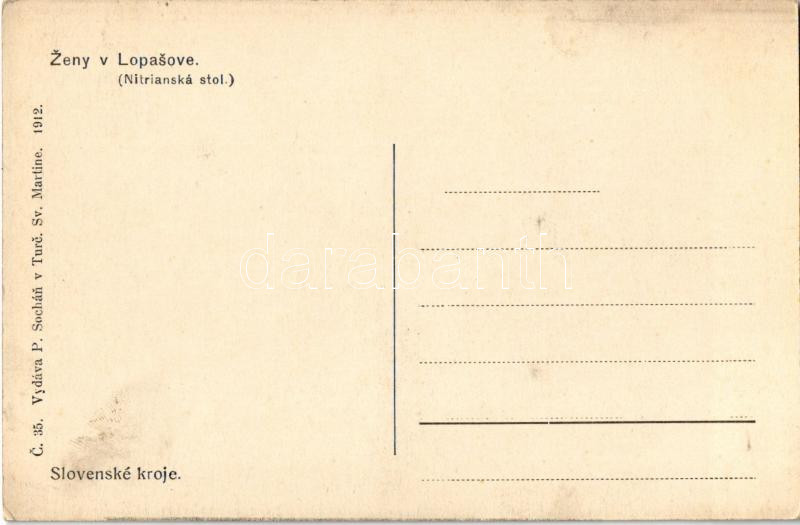 Lopassó, Lopasov; Zeny v Lopasove, Nitrianská stol, Slovenské kroje. P... https://www.darabanth.com/hu/472-Gyorsarveres/472.0/Kepeslapok/Felvidek~1500008/Lopasso-Lopasov-Zeny-v-Lopasove-Nitrianska-stol-Slovenske-kroje-P-Sochan-C-35-1912-lC3~II3199931