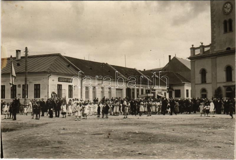 Mecenzéf, Alsó-Metzenzéf, Alsómecenzéf, Metzenzéf, Nizny Medzev; katolikus körmenet a templom előtt, Csereháti Bank, gyógyszertár, Bata üzlet / Catholic procession in front of the church, shops, pharmacy, bank. photo (fl)