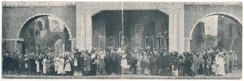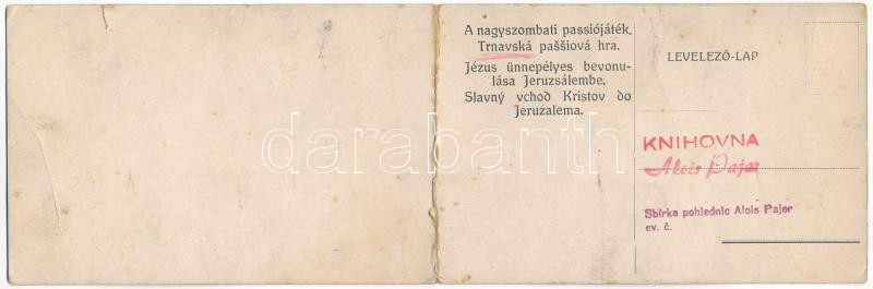 Leírás: Nagyszombat, Tyrnau, Trnava; Passiójáték: Jézus ünnepélyes bevonulása Jeruzsálembe, Krisztus üdvözli a szent keresztet - 2-részes kinyitható panorámalap / Trnavská passiová hra / Passion Play - 2-tiled folding panoramacard (szakadás / tear)