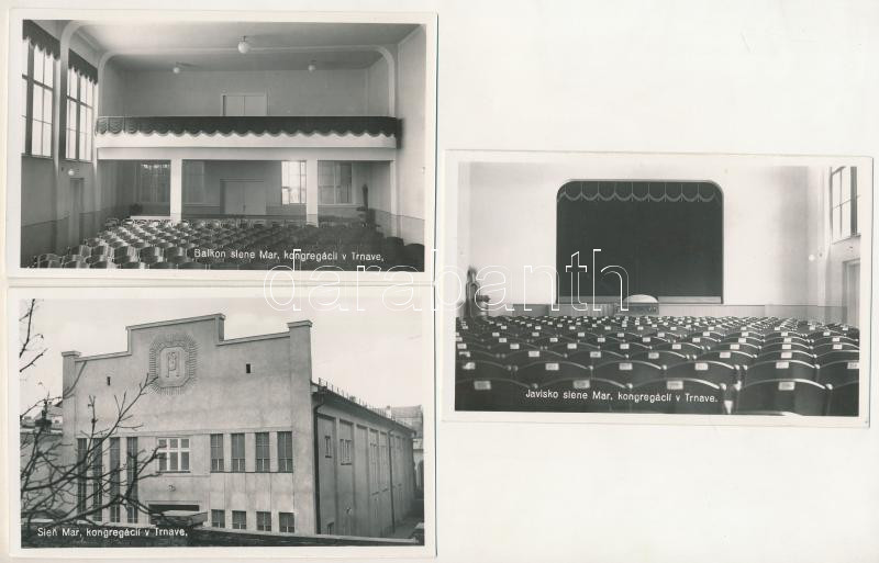 Nagyszombat, Tyrnau, Trnava; Sien Mar. kongregácií v Trnave, Javisko siene, Balkon slene / templom és belső terem - 3 db régi fotó képeslap / church and interiors - 3 pre-1945 photo postcards