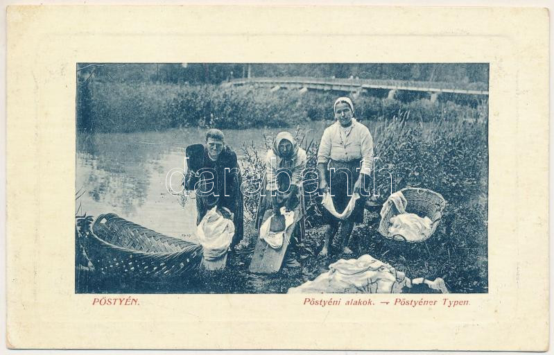 Pöstyén, Piestany; Pöstyéni alakok, mosóasszonyok a Vág partján. Schultz Paula kiadása. W.L. Bp. 878. / Pöstyéner Typen / Upper Hungarian (Slovak) folklore, women washing in Váh the river (EK)