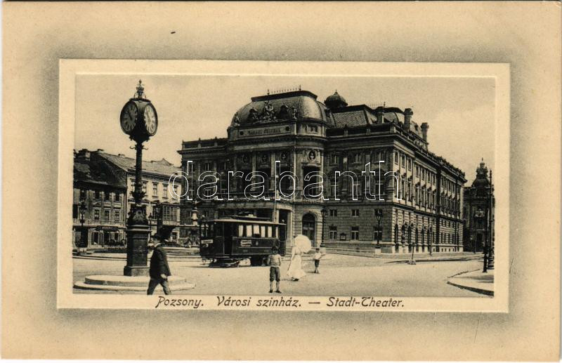 Leírás: Pozsony, Pressburg, Bratislava; Városi színház, villamos, Bohr Ernő üzlete / theatre, tram, shop