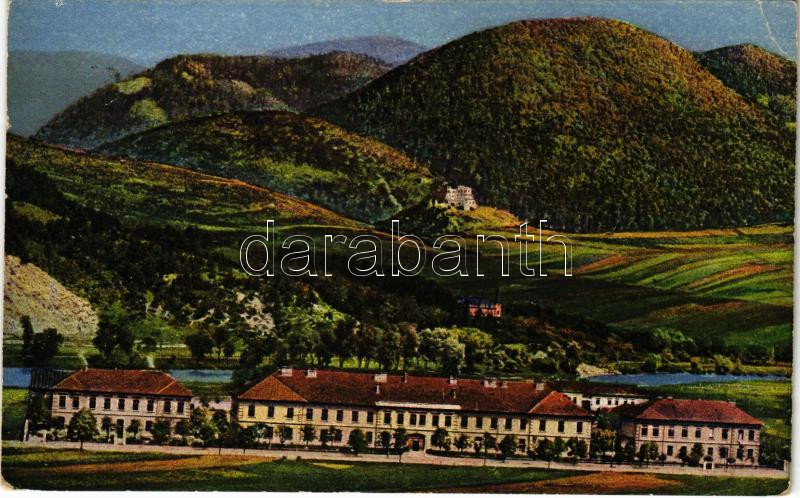 Leírás: Rózsahegy, Ruzomberok; Laktanya, Chocs hegy és Likava vára / Kasáren, Vrch Choc s Likavskym zámkom / military barracks, mountain, castle ruins (EK)