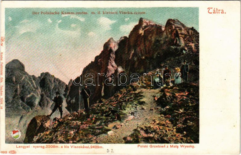 Tátra, Magas-Tátra, Vysoké Tatry; Der Polnische Kamm m. d. kleinen Visoka / Lengyel-nyereg a Kis-Viszokával. Feitzinger Ede 1904/14. 303. Auto-Chrom / Polski Grzebien z Mala Wysoka / mountain, hikers