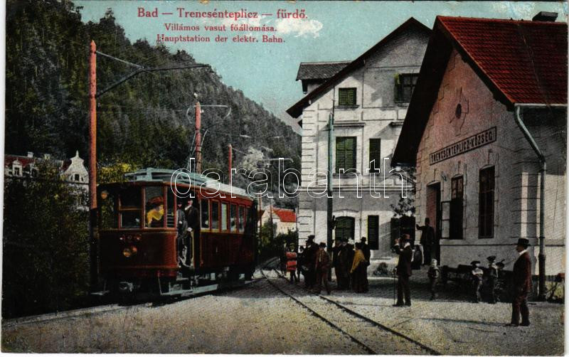 Trencsénteplic, Trencianske Teplice; Villamos vasút főállomása, vasútállomás. Kiadja Wertheim Zsigmond / Hauptstation der elektrischen Bahn / tram station, tramways, railway station (r)