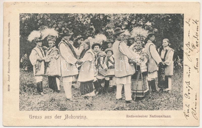 1901 Gruss aus der Bukowina. Ruthenischer Nationaltanz / Bukovinai népviselet, Rutén (ruszin) nemzeti tánc / Ruthenian (Rusyn) folklore from Bucovina, traditional dance. Josef Horowitz (Czernowitz) (ragasztónyom / glue mark)