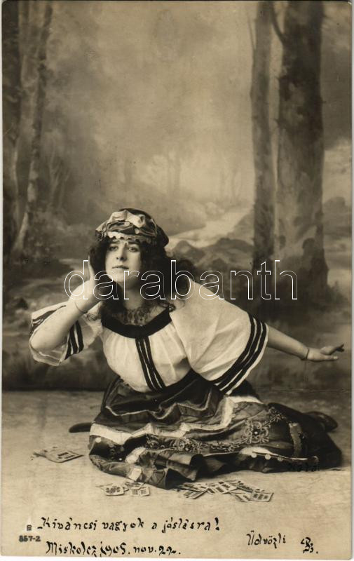 Leírás: 1905 Cigánylány magyar kártyával / Gypsy lady with German-suited playing cards