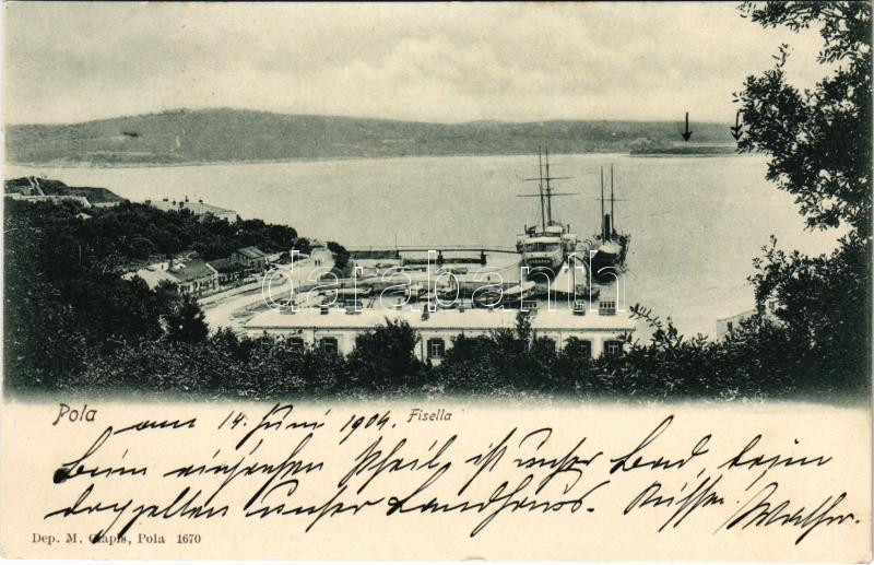 1904 Pola, Fisella, K.u.K. Kriegsmarine S.M.S. Alpha (ex Greif II) Torpedoschulschiff und SMS Spalato / SMS ALPHA (Alfa) cs. és kir. haditengerészeti torpedó iskolahajó és mellette SMS Spalato / Austro-Hungarian Navy torpedo school ship. M. Clapis Pola 1670.