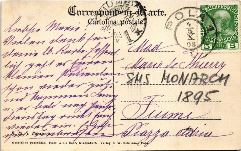 Leírás: 1908 SMS MONARCH Osztrák-Magyar Haditengerészet Monarch-osztályú partvédő páncélos / K.u.K. Kriegsmarine / Austro-Hungarian Navy coastal defence ship. Phot. Alois Beer, F.W. Schrinner (ázott sarok / wet corner)