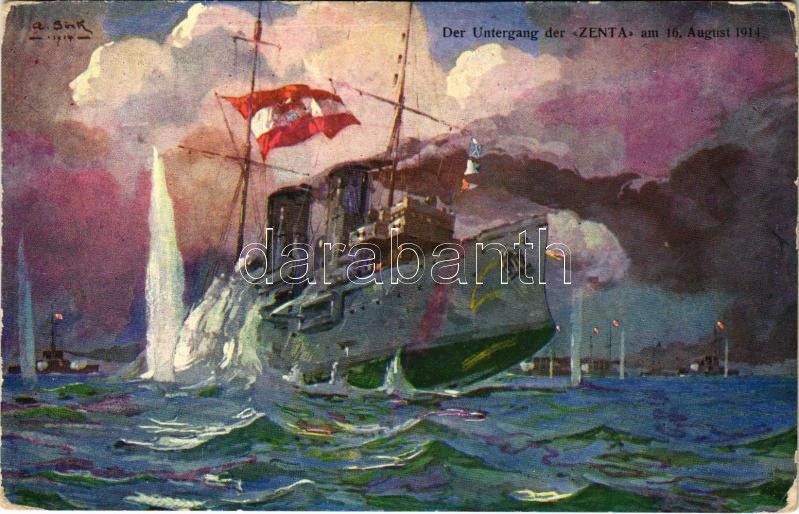 1915 Der Untergang der "ZENTA" am 16. August 1914. Offizielle Karte für Rotes Kreuz, Kriegsfürsorgeamt, Kriegshilfsbüro Nr. 31. / WWI Austro-Hungarian Navy, K.u.K. Kriegsmarine art postcard. The downfall of SMS Zenta protected crusier, sunk in the Battle of Antivari s: A. Sink (kopott sarkak / worn corners)